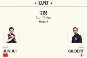 丁俊晖首轮对阵大卫·吉尔伯特,两个阶段分别在4月19日17:00和4月20日17:00。